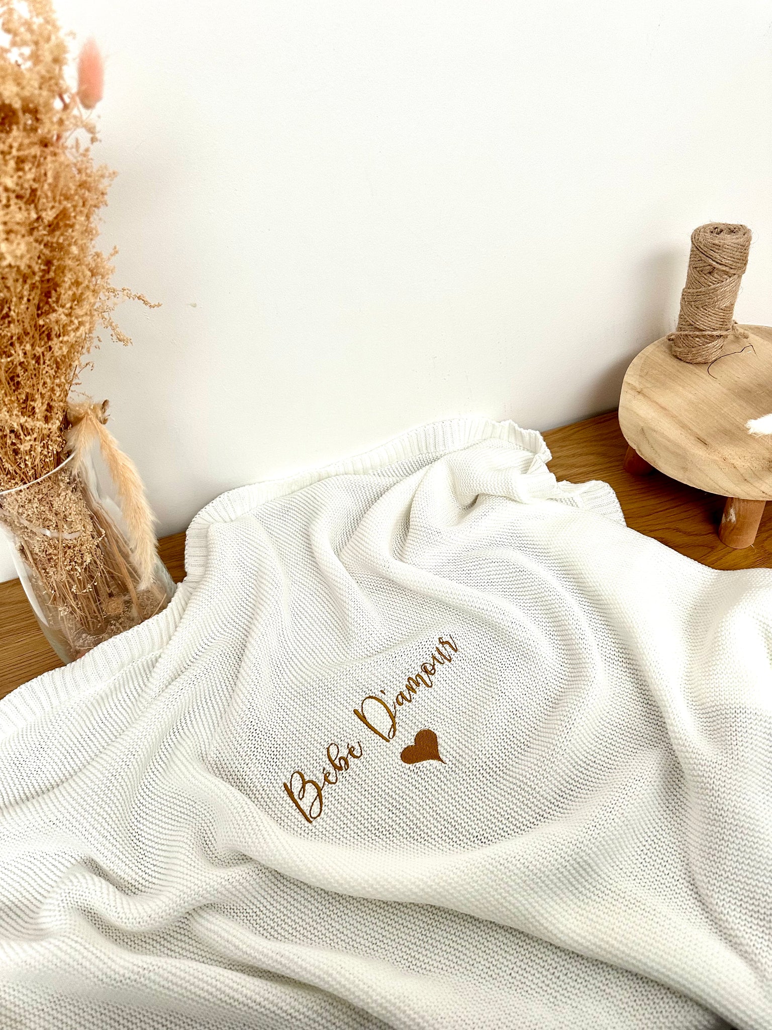 Couverture en maille douce personnalisée avec la broderie du prénom de bébé.