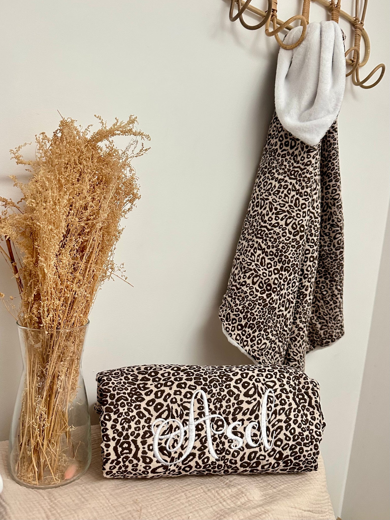 Couverture douce et légère en gaze de coton motif léopard avec intérieur molleton chaud. Prénom brodé dans notre atelier.