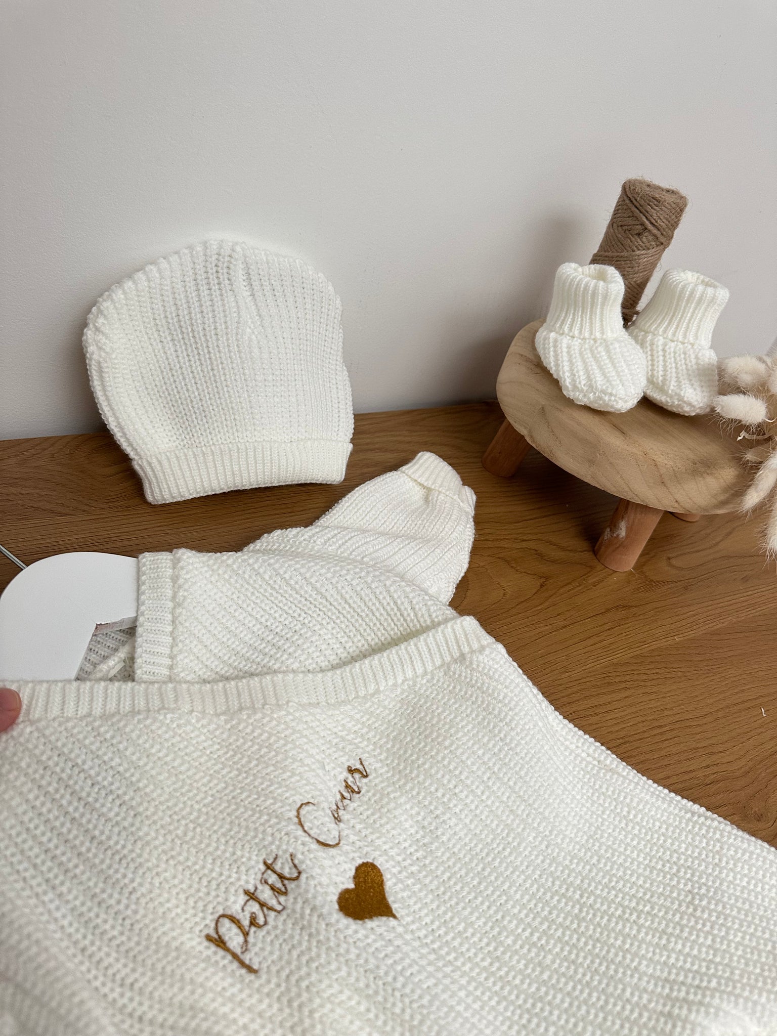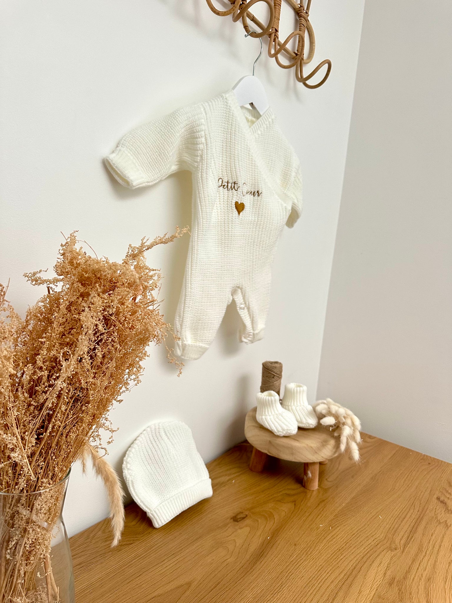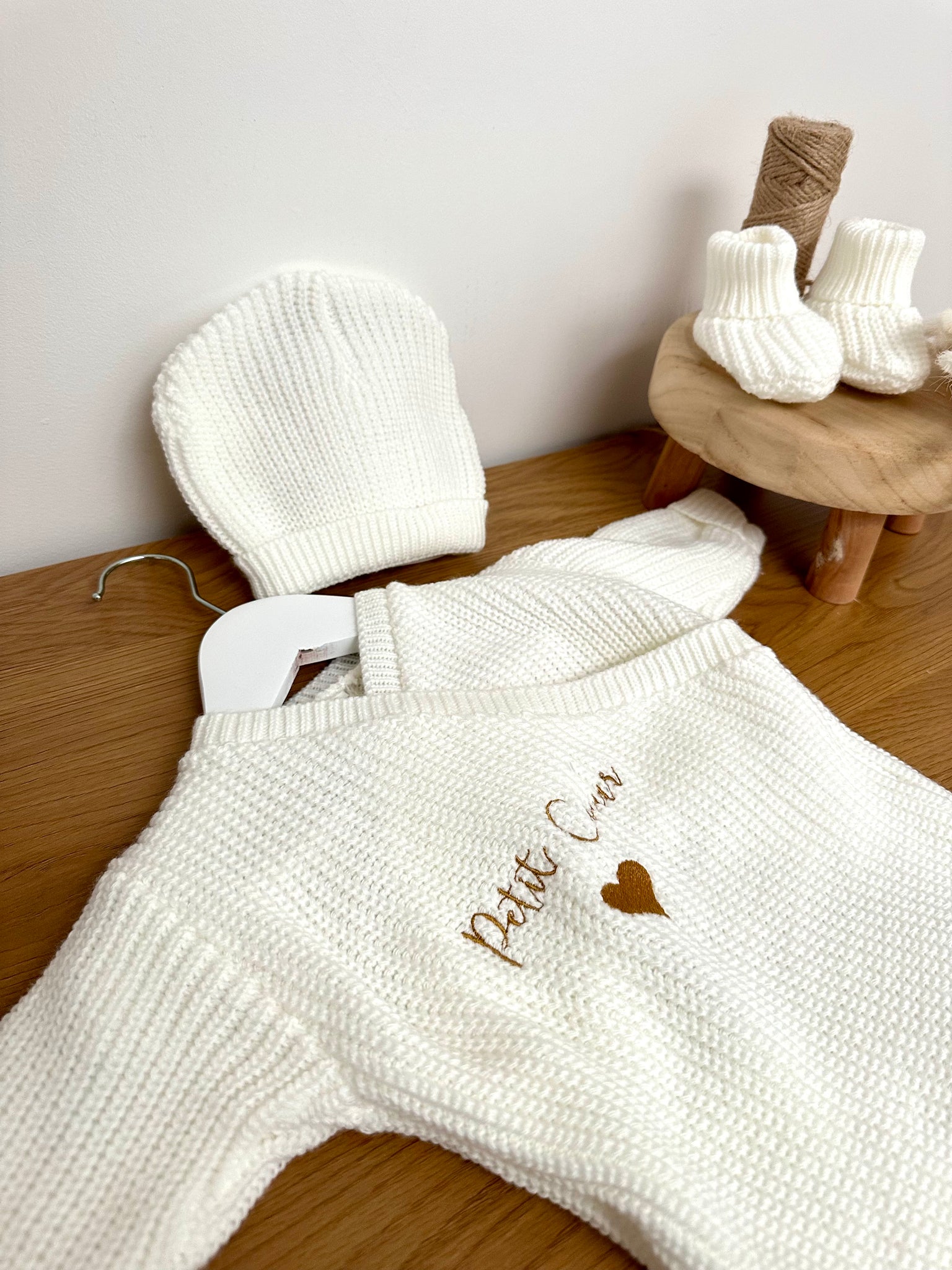Offrez un cadeau unique et précieux avec cet ensemble pyjama 3 pièces en maille douce, entièrement personnalisable avec broderie pour votre bébé.